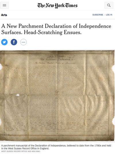 SAGE Serendipity: In the world of historical scholars an “archival drama” is playing out with the discovery in England of a second parchment copy of the Declaration of Independence. Historians hope the discovery casts light on the question — “Was the country founded by a unitary national people, or by a collection of states?” Read more about it in this New York Times article.